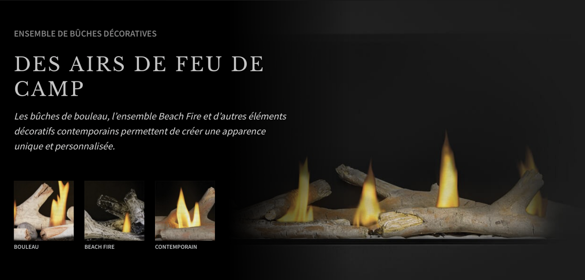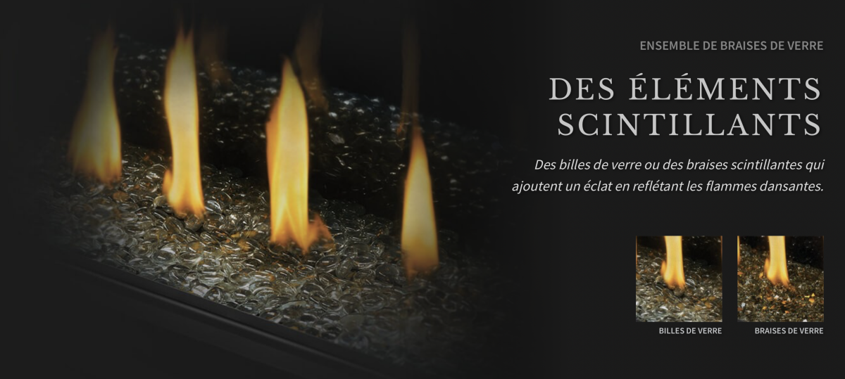 • Ensembles décoratifs optionnels : bâtonnets plaqués nickel, ensembles Mineral Rock, Shore Fire et Beach Fire, ensembles de braises de verre et de billes de verre de couleurs variées!